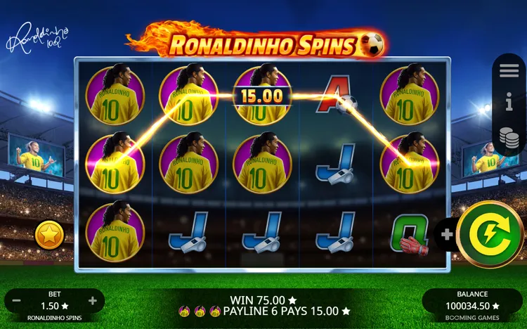A estrutura de Ronaldinho Spins é composta por 5 bobinas, 3 linhas e 10 linhas de pagamento fixas. O objetivo é formar combinações de símbolos idênticos para desbloquear prêmios e recursos interativos, sempre mantendo uma mecânica simples e fácil de entender — mesmo para quem está começando no mundo dos jogos de cassino online.