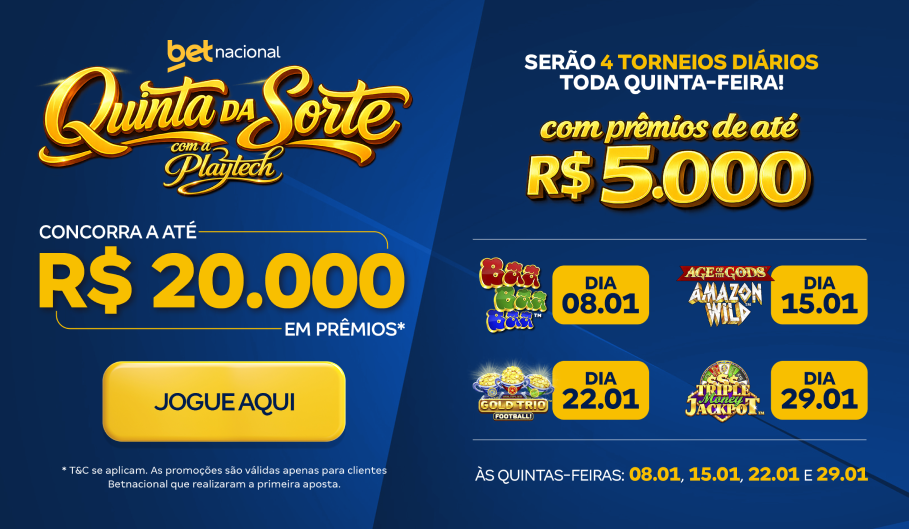 Janeiro ficou mais divertido na Betnacional com o lançamento do torneio Quinta da Sorte. Uma promoção semanal, em parceria com a Playtech, que distribui prêmios a cada quinta-feira do mês.